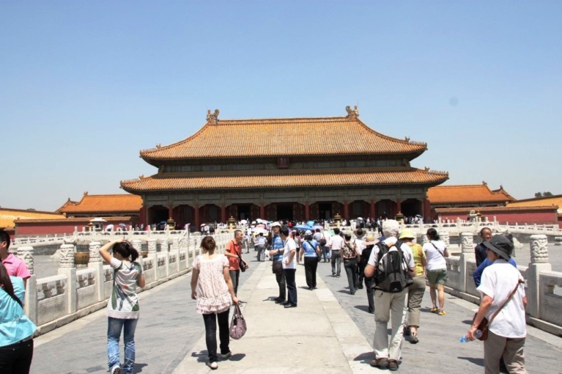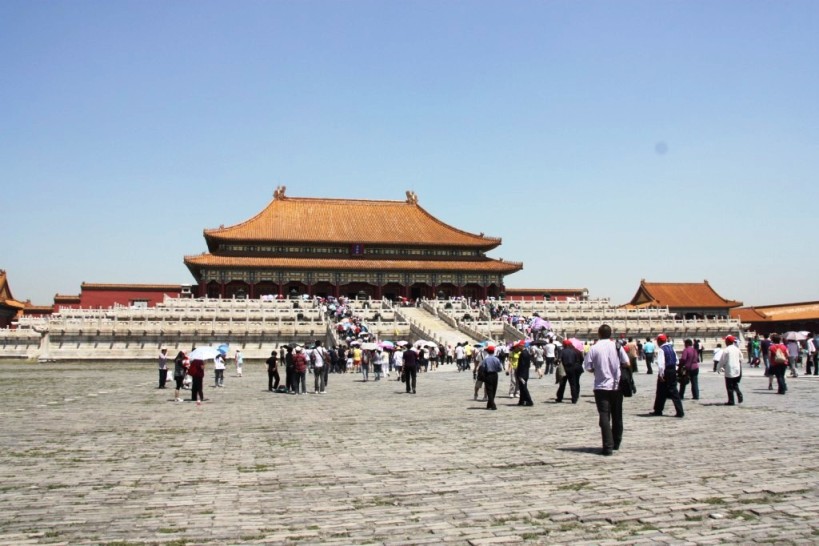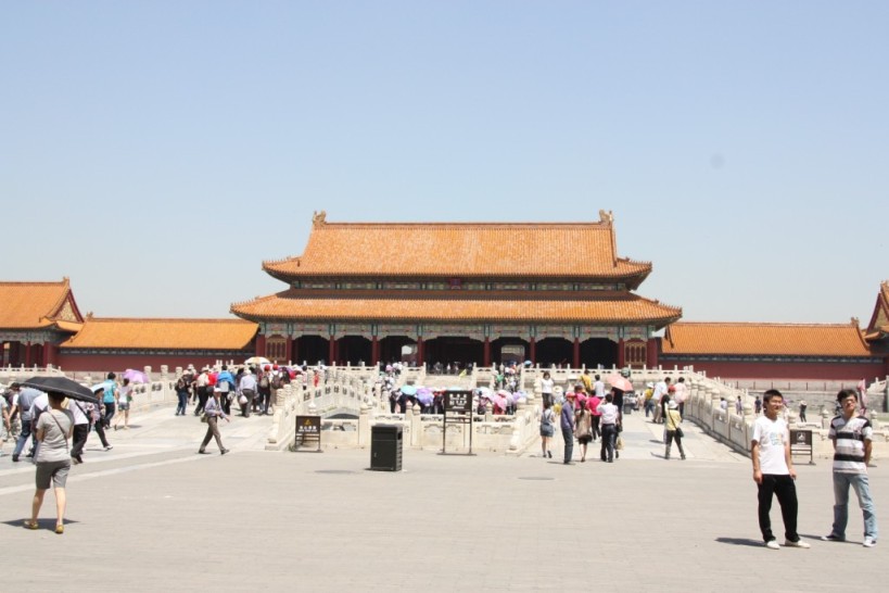 Construite à partir de 1407, les travaux réalisés par quelques 200 000 esclaves ouvriers durèrent – seulement – 14 ans. Il faut dire que le palais, situé en plein cœur de la ville est impressionnant par ses dimensions : il a la forme d’un grand rectangle qui s’étend sur 72 hectares. Entourée de fossés protecteurs (et remplis d’eau) que surplombe une muraille de 10 mètres de hauteur, la Cité Interdite renferme ainsi les différents palais (séparés par 3 esplanades), la résidence de l’empereur et de sa famille, ses serviteurs le tout avec de beaux jardins et même une petite rivière qui s’écoule sereinement.