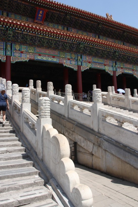 De plus, le 9 représente le chiffre le plus puissant du Yang (comme Yin&Yang…), symbole du masculin, du soleil, donc de la clarté et de la chaleur, du positif aussi (donc par opposition, le Yin, est féminin, c’est la lune, le négatif, le froid… Non non, le monde chinois n’est pas du tout macho !). Du coup, on retrouve le 9 un peu partout : il y a 9 grandes portes pour accéder au site, sur lesquelles il y a 9 rangées de 9 clous dorés… Ou encore des escaliers sculptés de 9 dragons (sur un bloc de pierre de 200 tonnes).