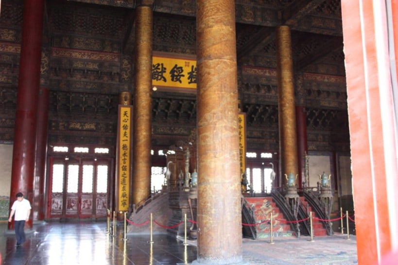 Toujours bâti selon des règles fengshui bien précises (que je ne détaillerais pas ici… non pas que je n’ai pas le temps, mais parce que je ne les connais pas), on trouve du sud (l’entrée principale) au nord les différents bâtiments administratifs – pour les fonctionnaires et les militaires – et officiels, donc pour les réceptions et avec des noms pour le moins grandiloquents tels que : « palais de l’harmonie suprême » (la plus grande construction en bois de toute la Chine), « palais de l’harmonie préservée »…
