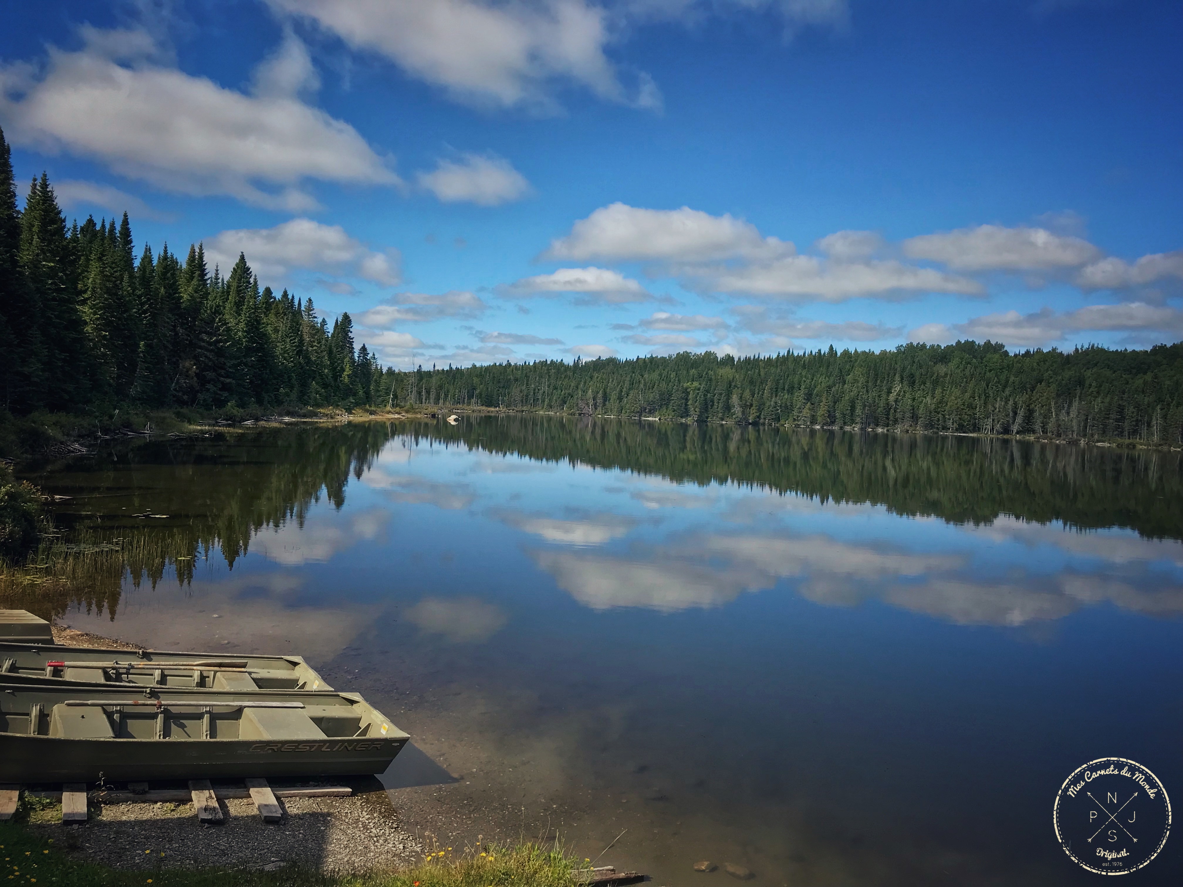 Et comme la dite pourvoirie est située à 500 mètres d’altitude, la pente qui y conduit est parfois un peu raide… A tel point que, le pied écrasé sur l’accélérateur, le moteur pousse des cris d’orfraie trahissant un manque de d’adhérence en montée, et que les roues chassent les gros cailloux et patinent en descente et glissent sur les graviers… C’est « l’fun » pour essayer de garder de l’adhérence en descente et pas se planter contre un arbre, ou dans l’eau : la piste est en effet bordée de hauts sapins, boulots, érables, fougères, rochers et marécages ; c’est quand même très beau…