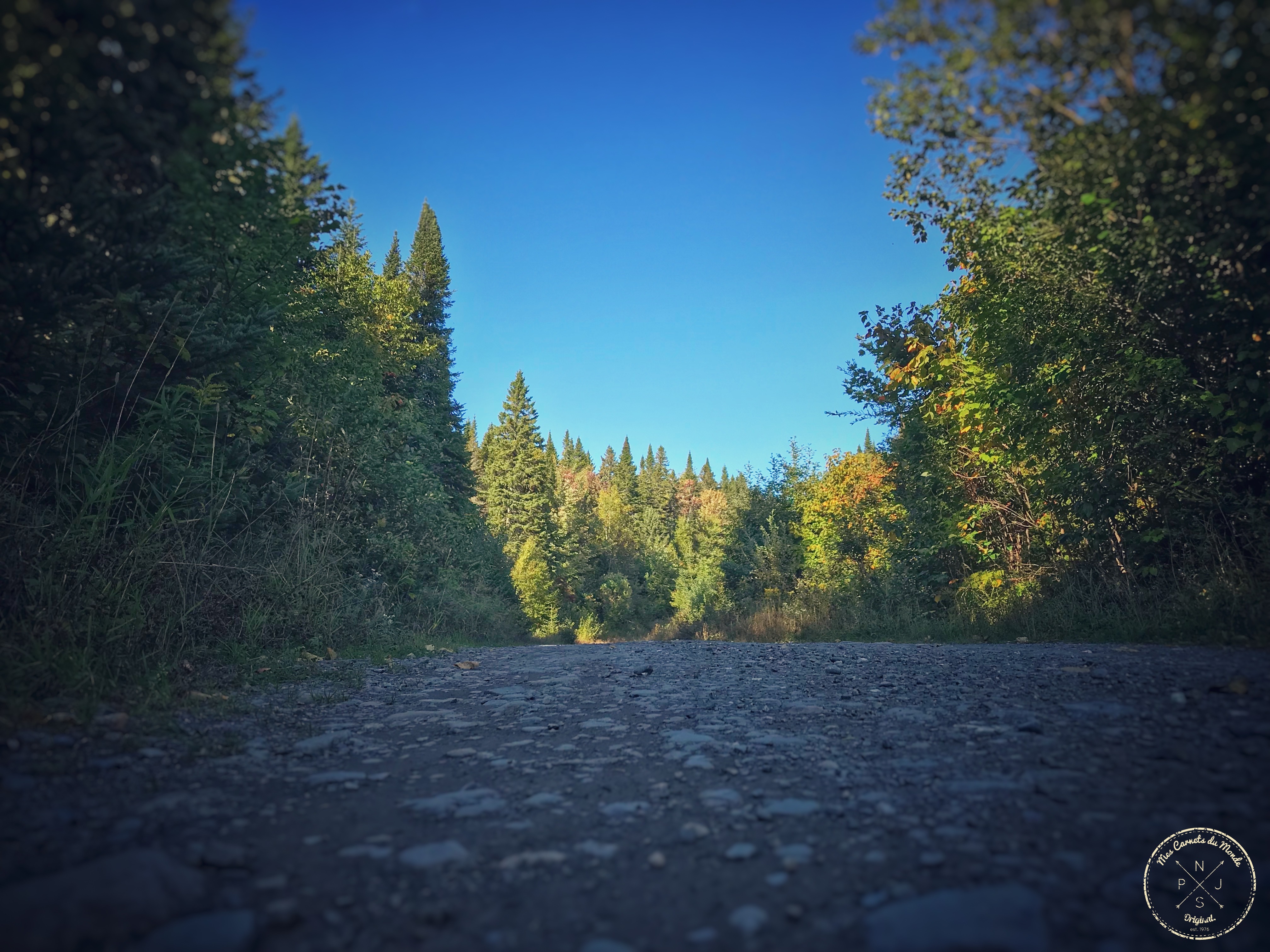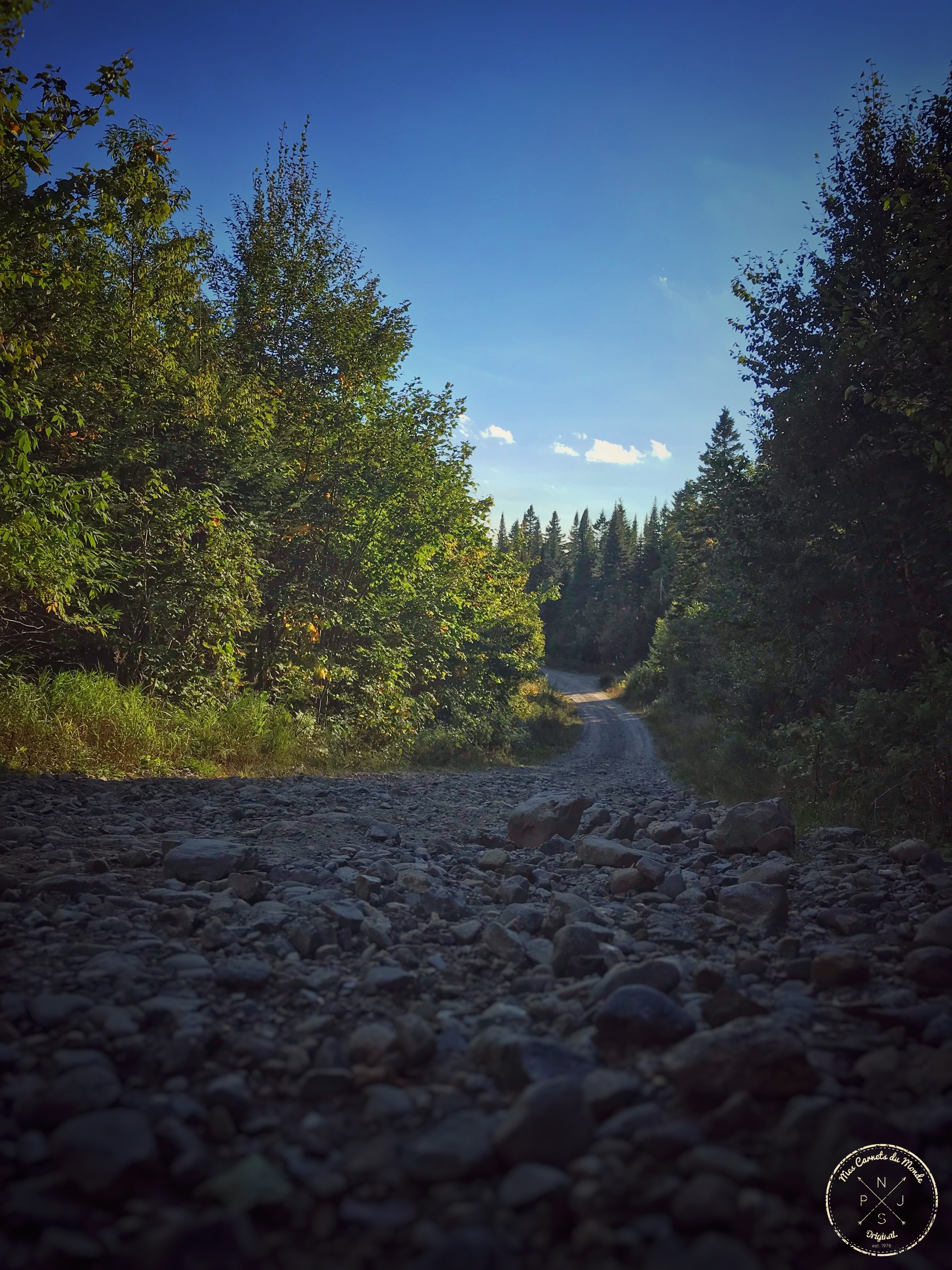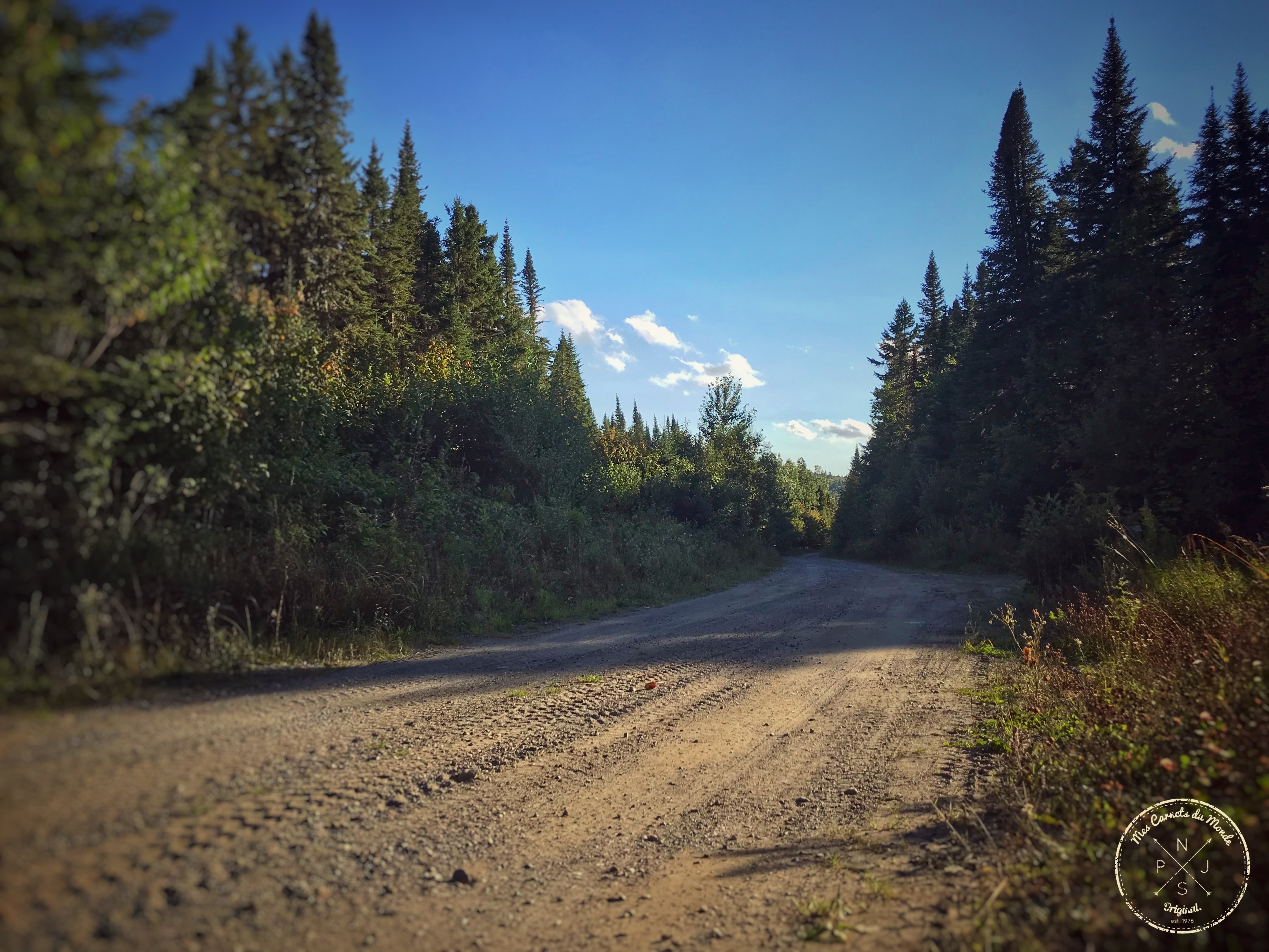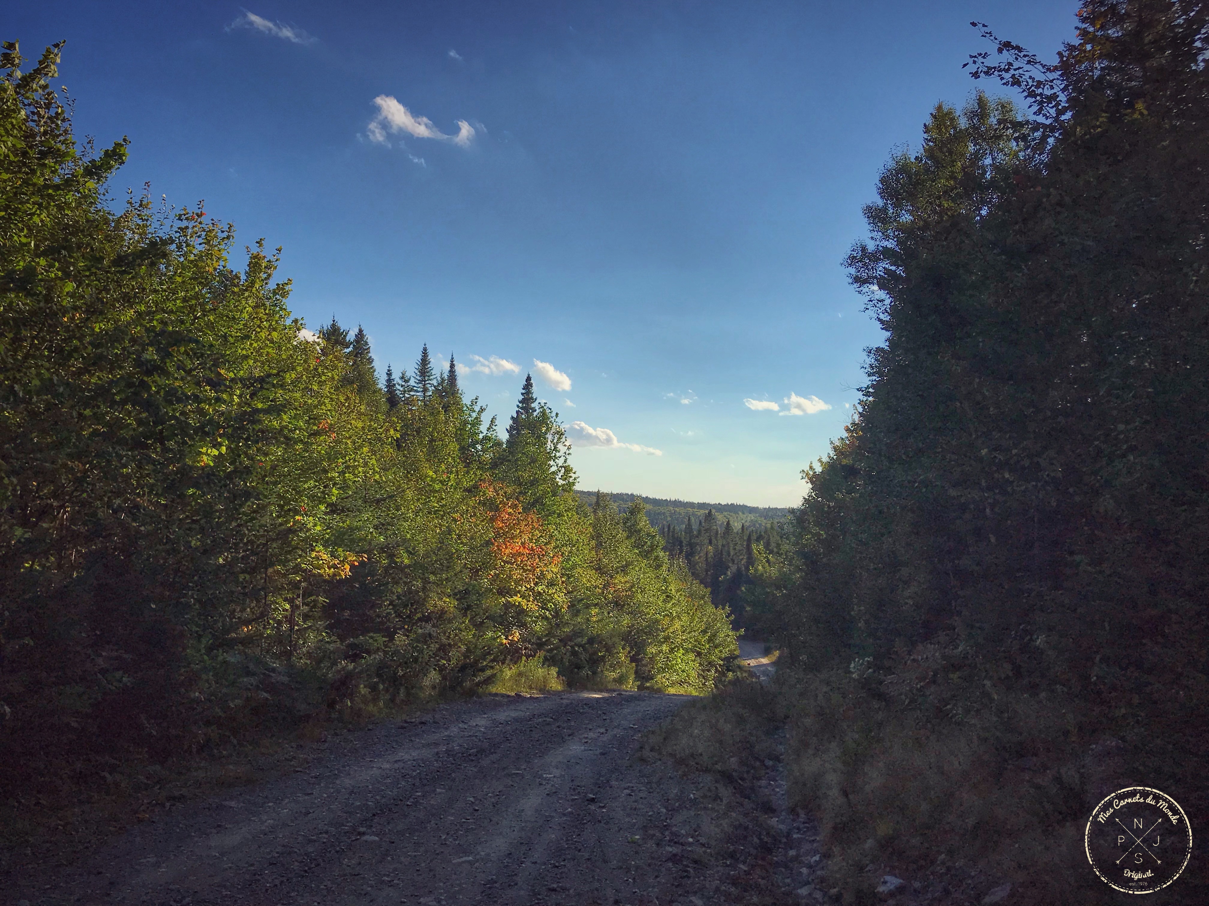 En effet, pour rejoindre la pourvoirie, après avoir passé le village de Trou-à-Pépettes (dingue, moi qui me moquais du nom du village… Je n’aurais peut être pas dû… Il doit y avoir un Karma après tout !) la route se transforme en piste, puis en chemin avec des petits-puis-des-gros-et-enfin-des-très-gros cailloux-qui-cachent-de-nombreux-trous (j’ai mes vertèbres lombaires qui ont fait connaissance avec mes vertèbres cervicales et qui ont eu le plaisir de se retrouver à plusieurs reprises tout au long du trajet… je crois qu’elles se sont bien liées d’amitiés ! Heuuuu, y’a un ostéo dans les bois ?), ce qui fait que l’adhérence, comme la vitesse sont nettement réduites.
