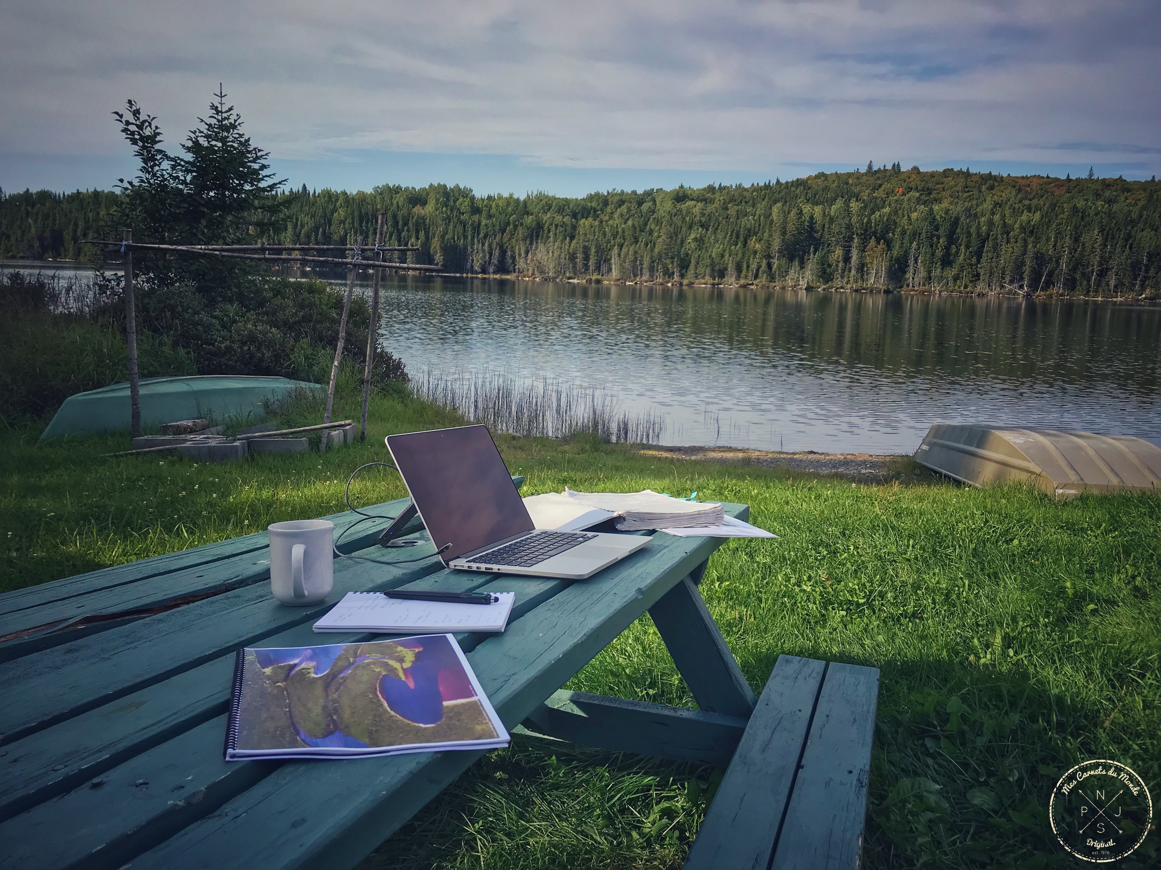 Vu que je suis aussi venu pour aussi continuer de travailler sur le business plan du projet, quand le temps le permets j’improvise un bureau en extérieur avec une vue imprenable sur le périph’ lac (sinon le plus proche possible du poêle !)