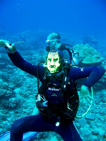 Et pendant qu’Eric nous invite à regarder quelques requins passant non loin, il enlève masque et détendeurs et revêt un masque de vampire ! Sa devise : les poissons, c’est sympa, mais ils ne sont pas très rigolo…