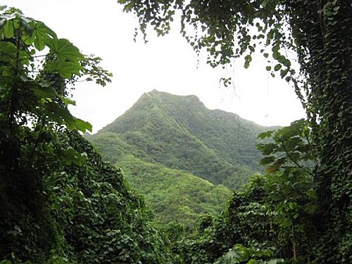 en prenant un peu d’altitude (le sommet de l’île est à 400m), le paysage devient grandiose : quelques cultures en terrasse, entourées d’une épaisse végétation recouvrent les flancs escarpés de l’ancien volcan (« qu’on croyait trop vieux… ») que ceinture le lagon, au loin.
