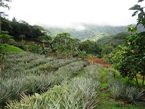 La première visite est une plantation. Les propriétaires (la famille d’Hinano) y cultivent, entre autres mangues, papaye et ananas, de la vanille.