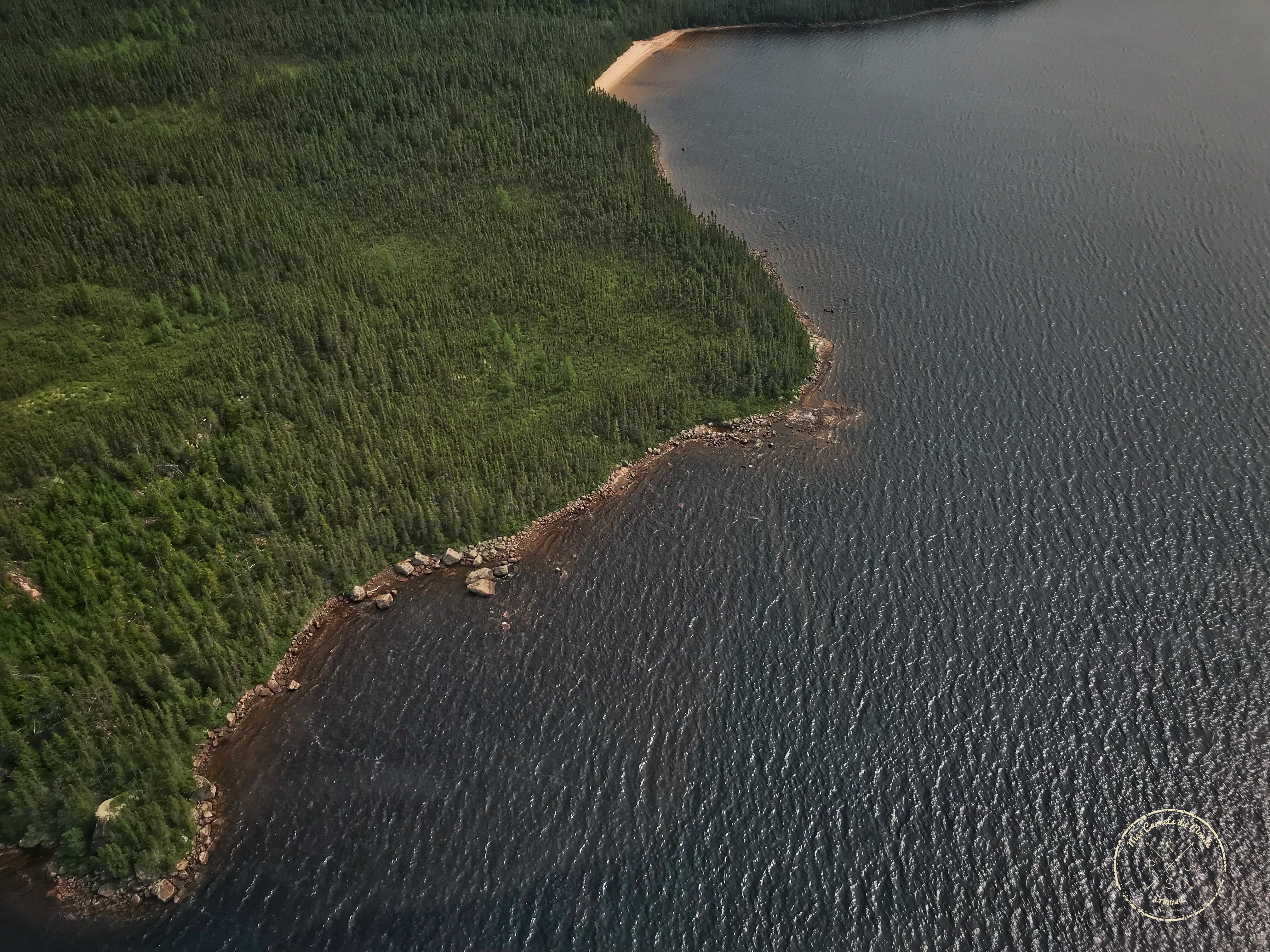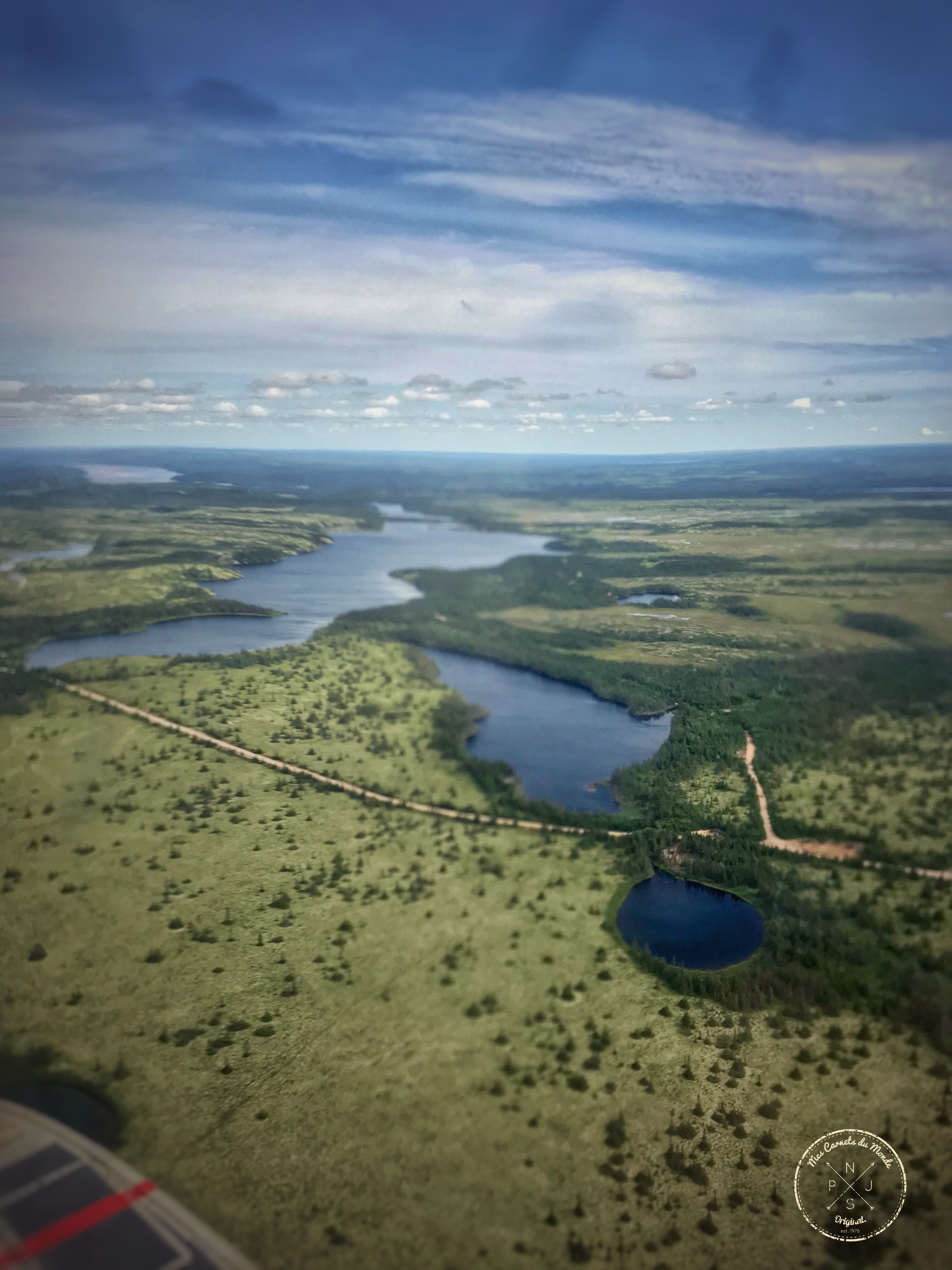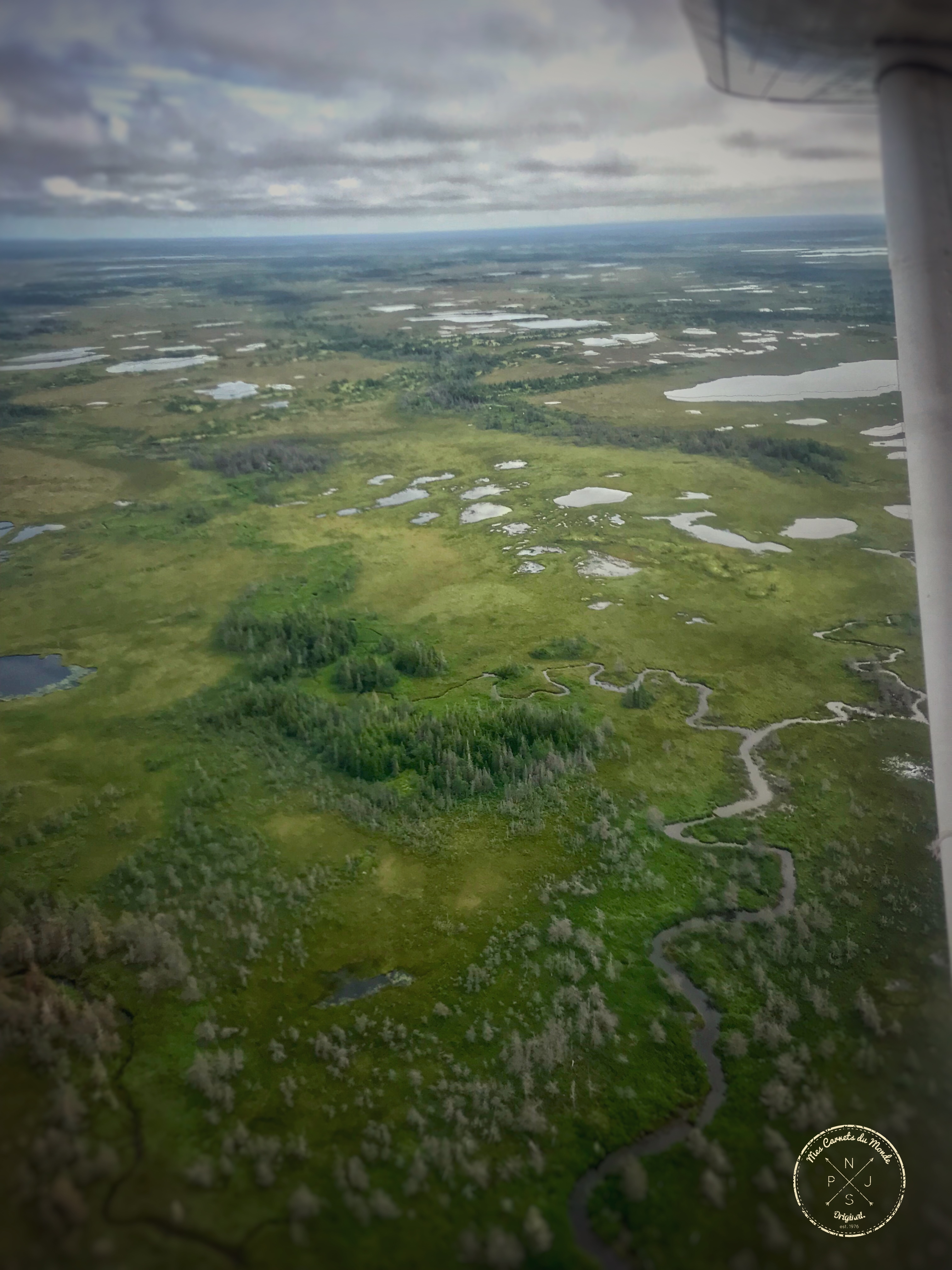 Alors que nous quittons la côte et pénétrons dans le territoire, les tourbières cèdent la place à une dense forêt, percée de multiples grands lacs aux eaux bleues-noires et vaguelettes couleur or en reflet du soleil. La vue depuis le ciel est tout simplement spectaculaire (et surtout, il n’y a pas de maringouins dans l’avion !!)