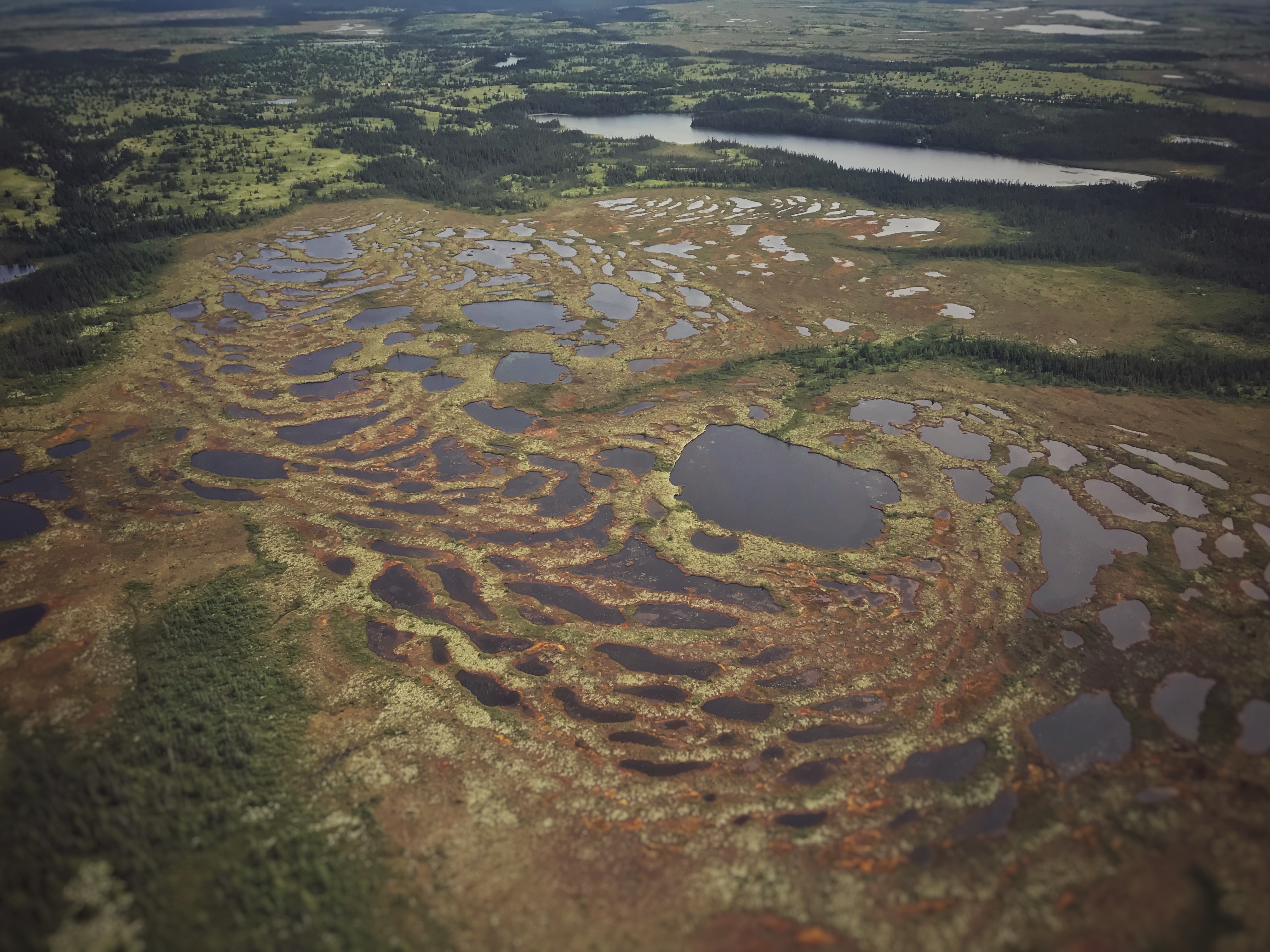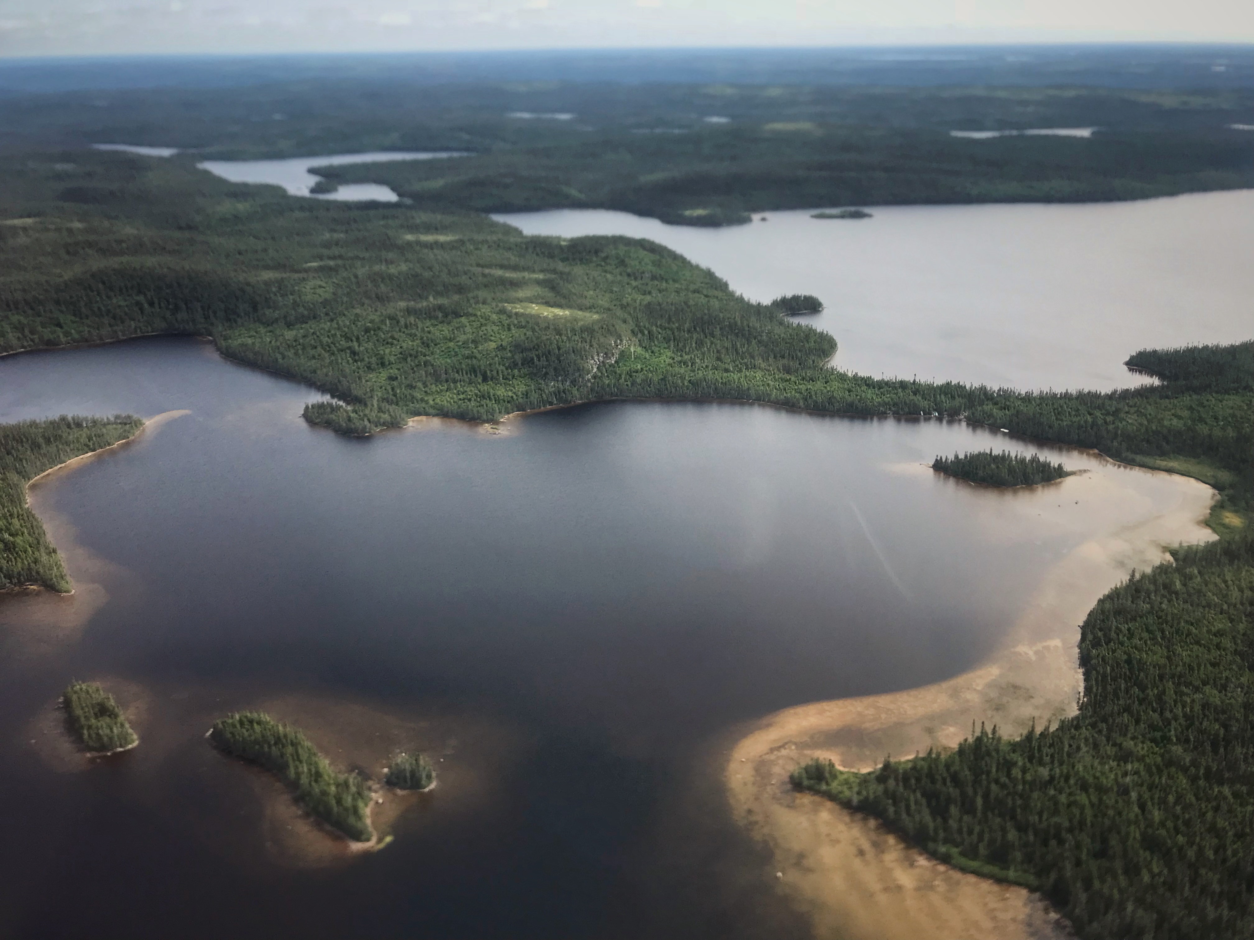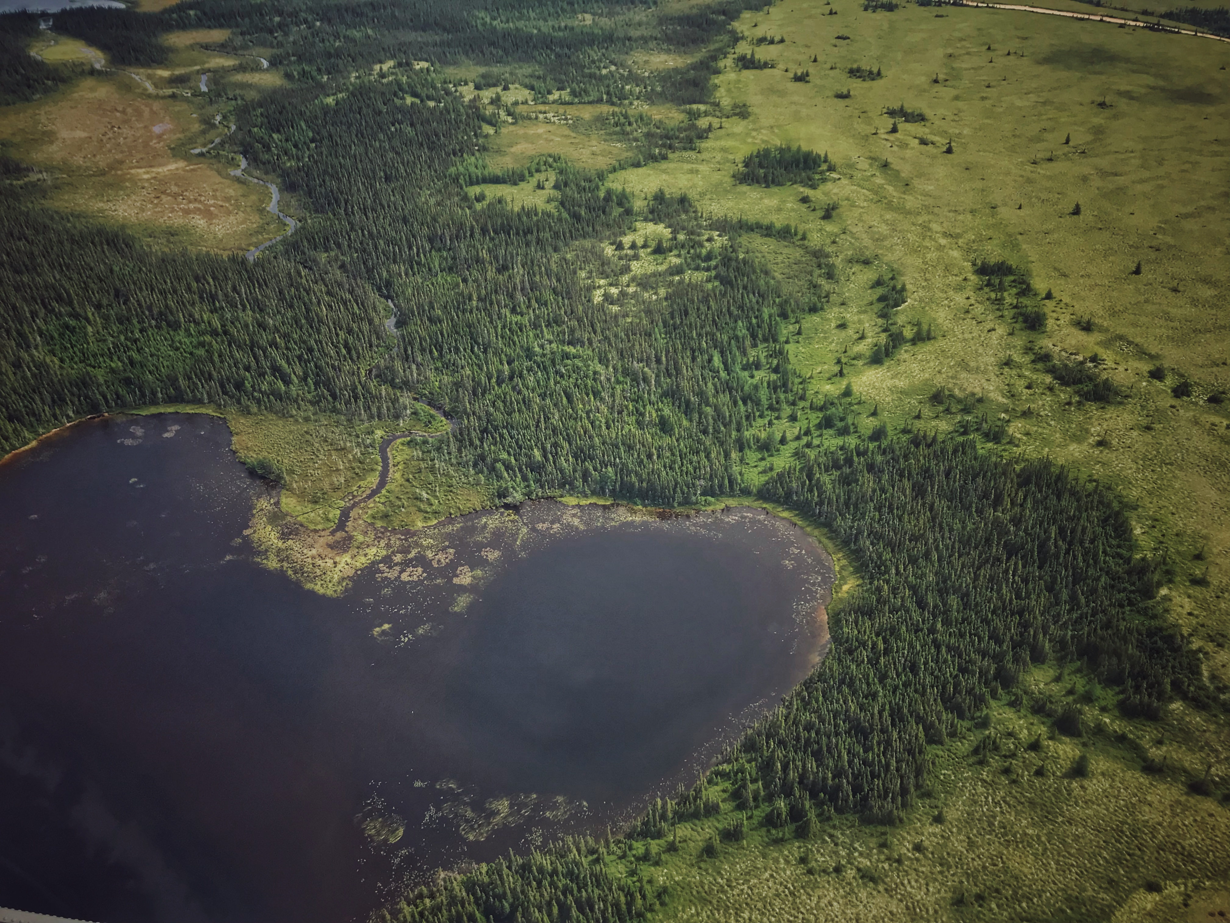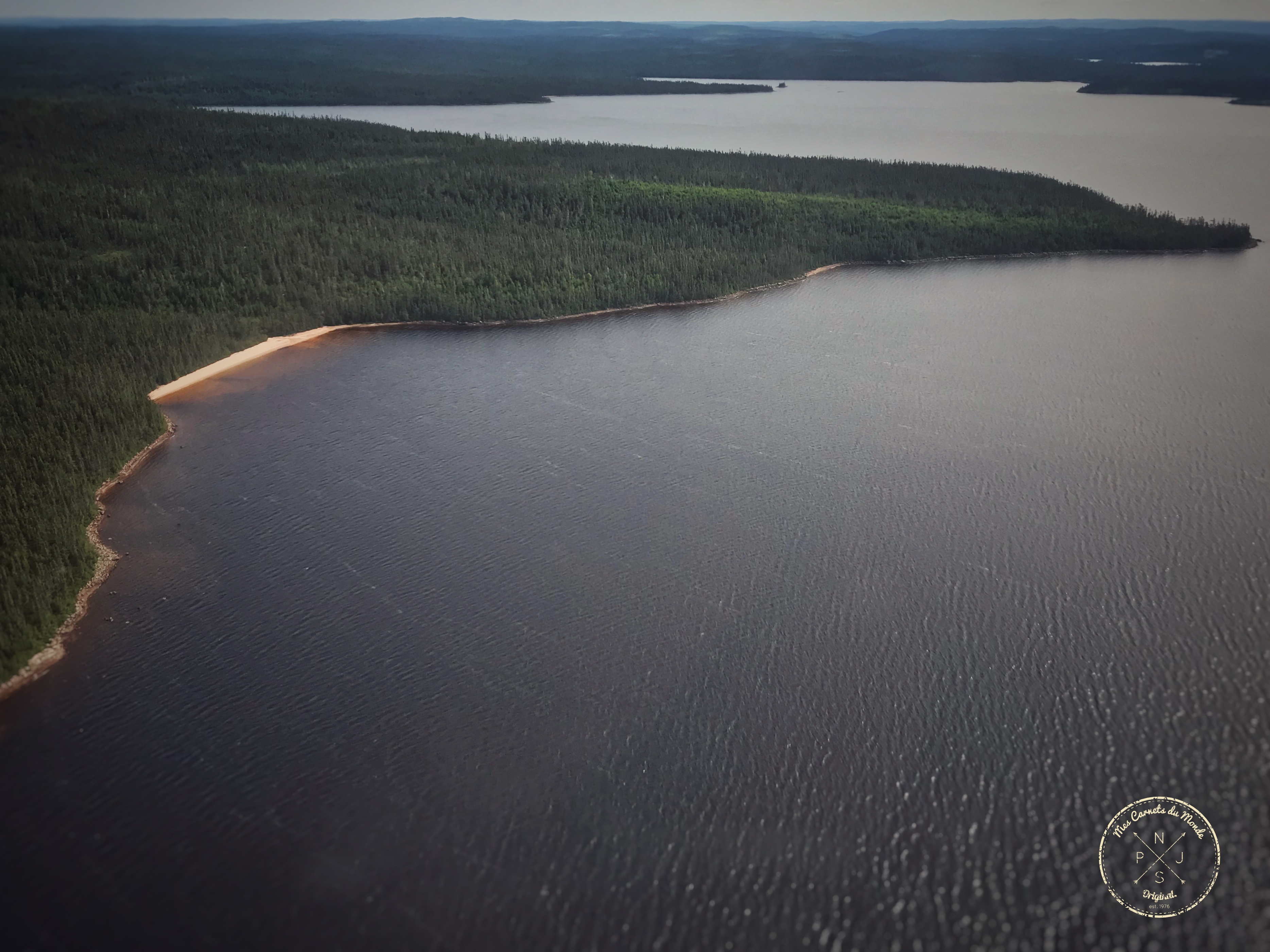 Alors que nous quittons la côte et pénétrons dans le territoire, les tourbières cèdent la place à une dense forêt, percée de multiples grands lacs aux eaux bleues-noires et vaguelettes couleur or en reflet du soleil. La vue depuis le ciel est tout simplement spectaculaire (et surtout, il n’y a pas de maringouins dans l’avion !!)