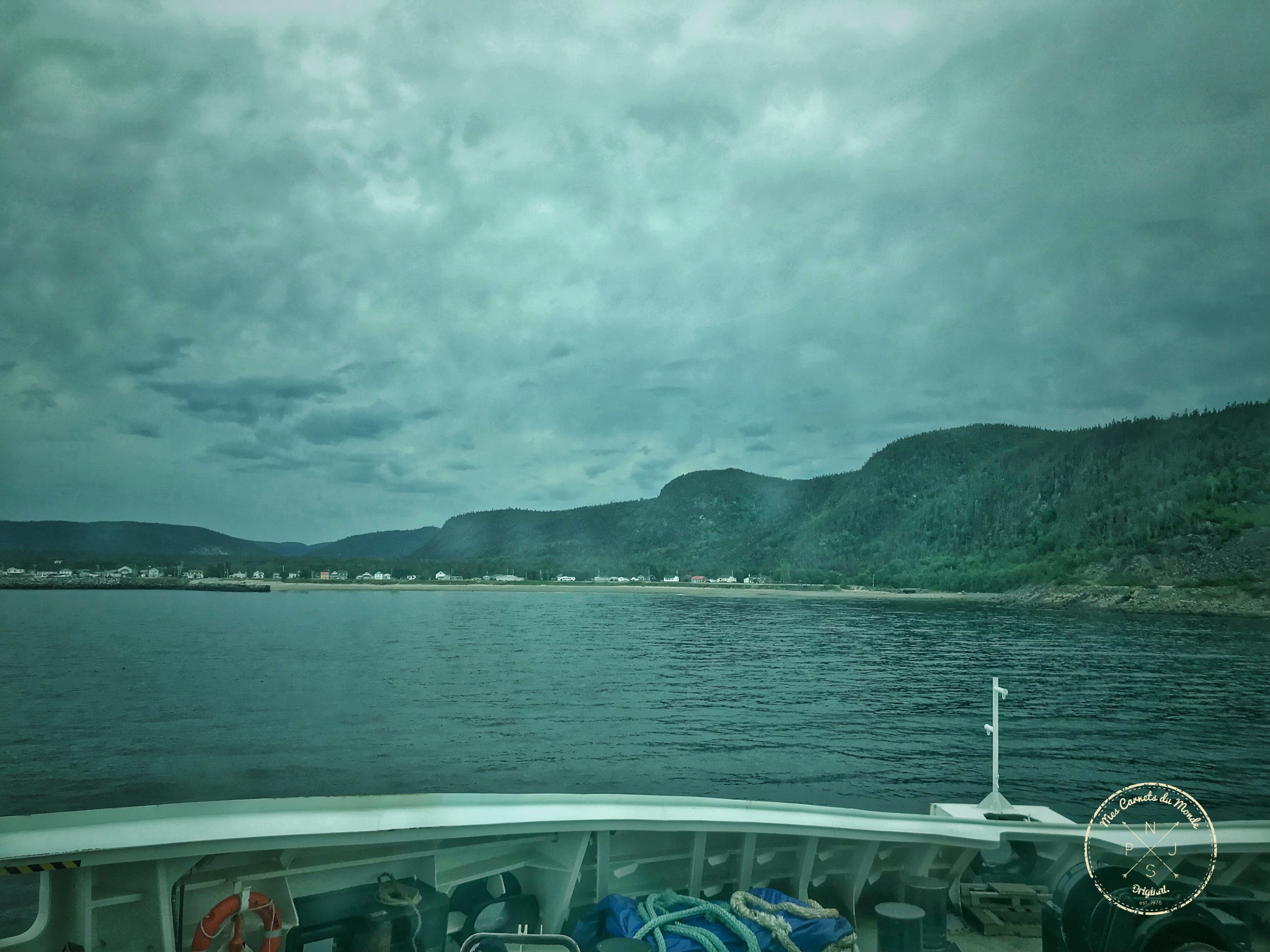 Notre but atteint avec une confortable avance de 45 minutes sur le timing, nous embarquons à bord du ferry ; Et les amarres larguées, le capitaine nous éloigne des rivages de la Gaspésie, alors que nous prenons – enfin – un bon petit déjeuner !