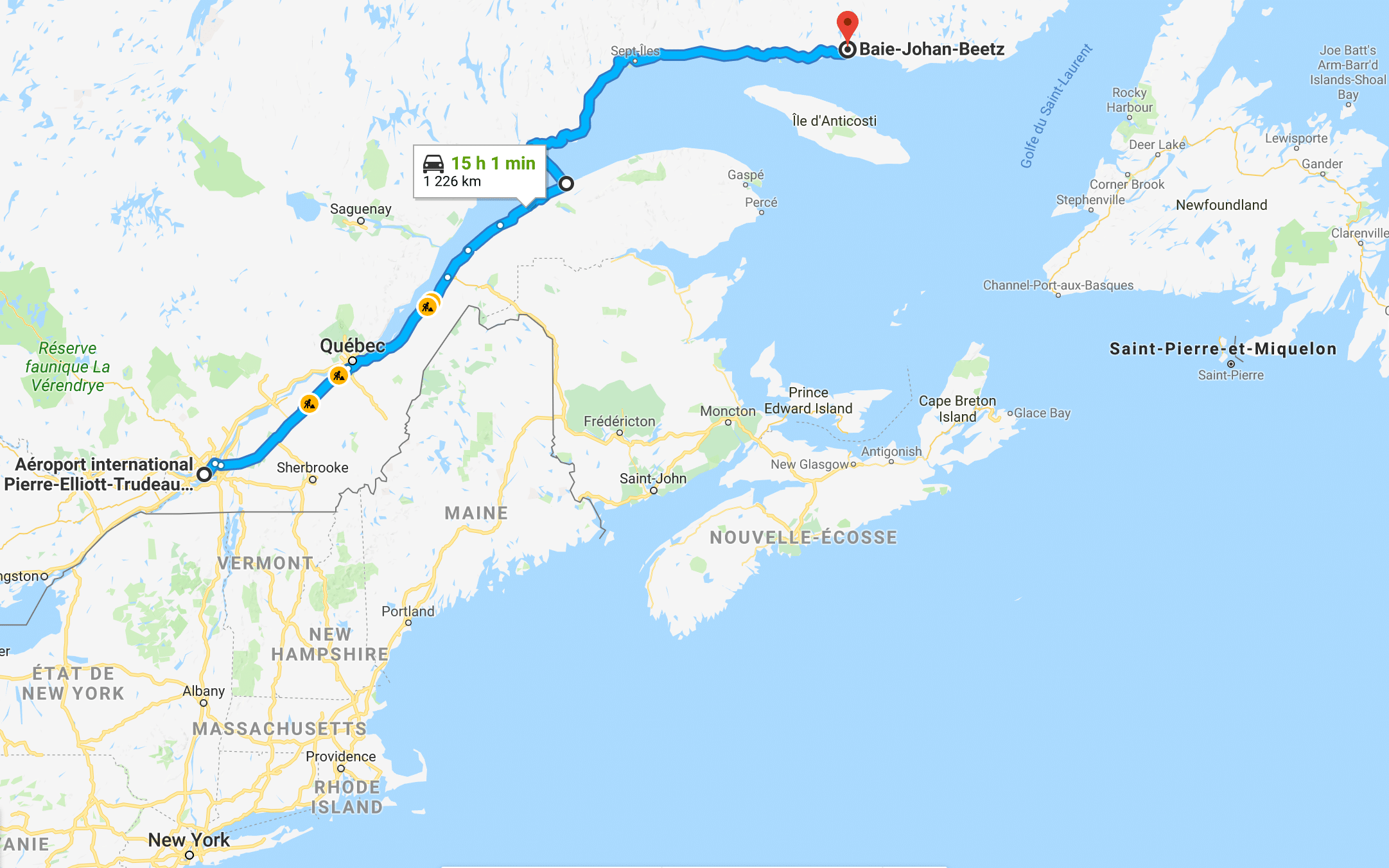 C’est donc parti pour un périple de 31 heures dans la « Belle Province« , afin de relier notre destination finale, incluant 17 heures de voiture, 2h30 de ferry, des arrêts pipi plein d’essence, des pauses repas, des courses complémentaires et une nuit chez un ami de la famille, histoire de couper un peu la loooooooooooongue route !