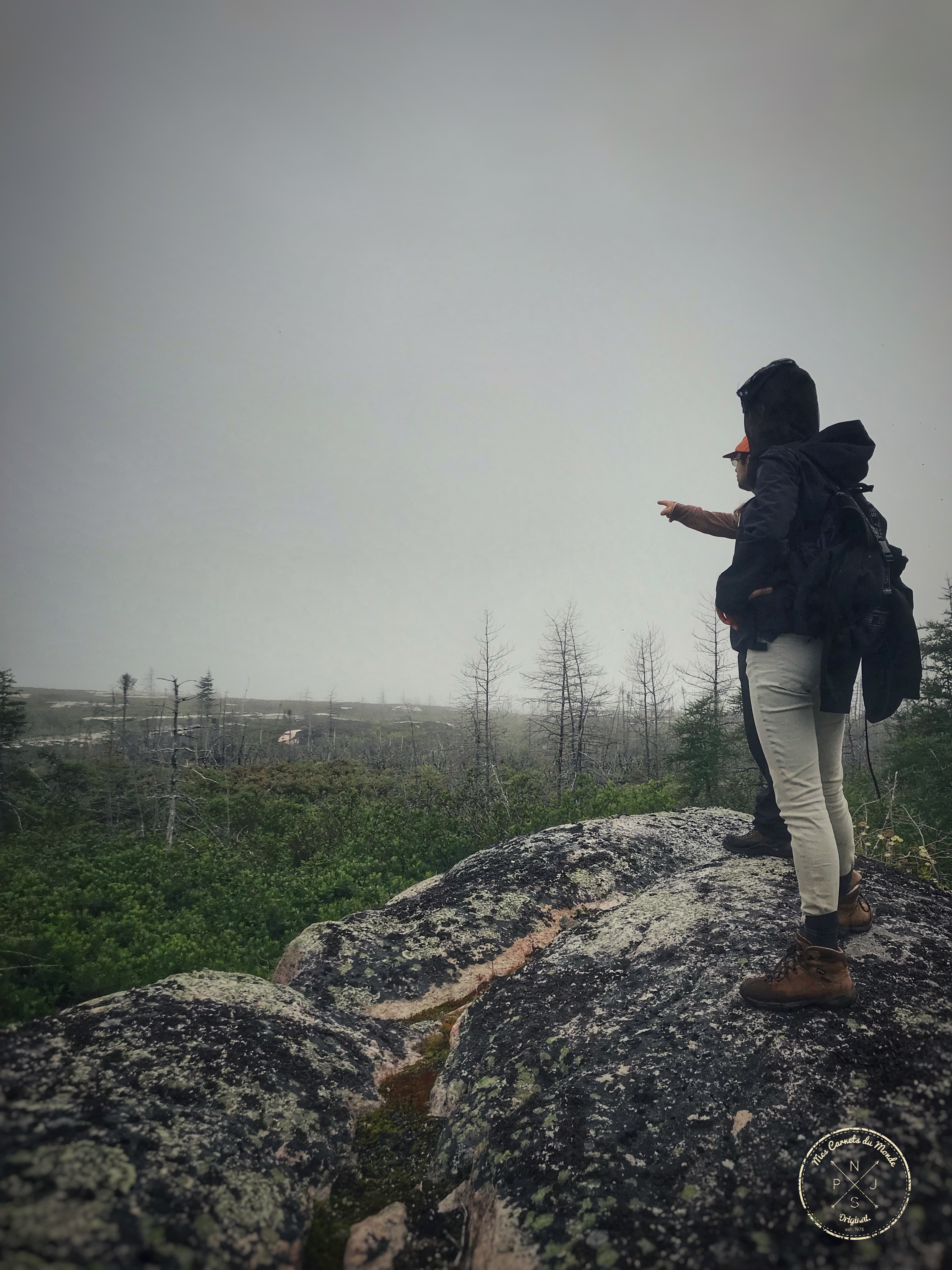 Et donc, la voiture garée au bord de la Route 138, au point kilométrique correspondant au début du chemin de randonnée en lisière de forêt, sur les terres de la pourvoirie, nous pénétrons dans les bois, enjambant les troncs morts, écartant les branches brûlées – lesquelles tracent nos vêtements et visages de traits carbonés. Nous réussissons, à force de se contorsionner à s’en extraire, à déboucher sur une immense tourbière, dont les seuls reliefs sont les rochers de granite roses et gris qui la déchirent, et les forêts de sapins, bouleaux et épinettes.