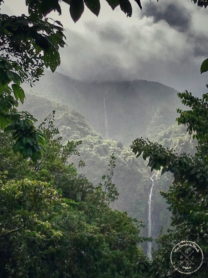 Avant d’entamer la randonnée en direction des cascades du Carbet, nous nous arrêtons en retrait du chemin, au bord de la forêt, où une petite plateforme découvre une vue splendide sur 2 des 3 cascades !