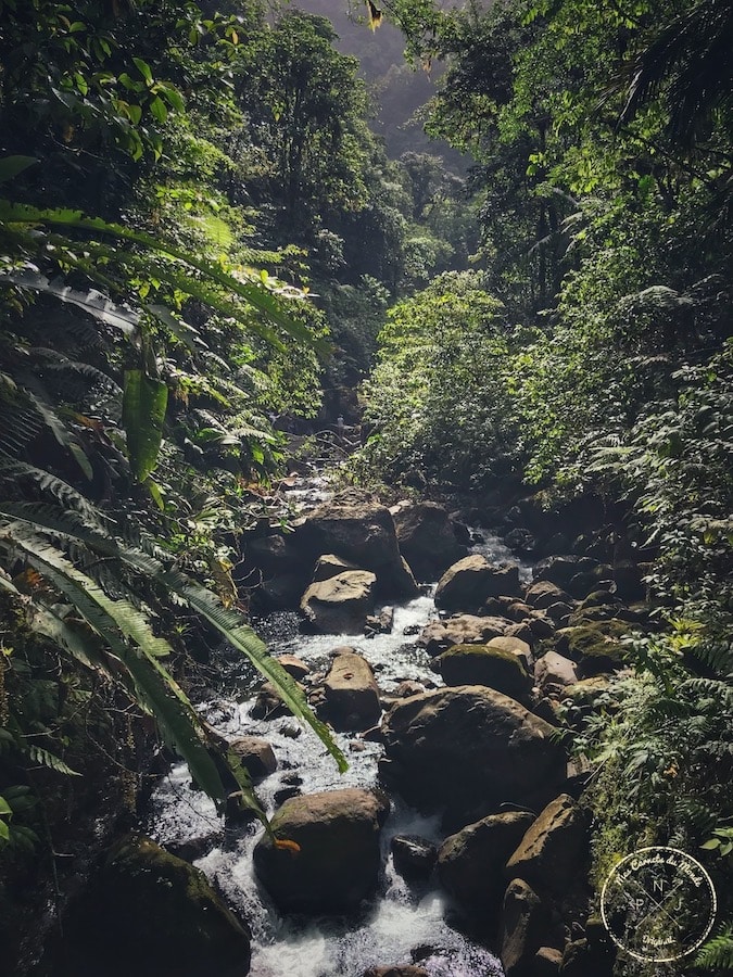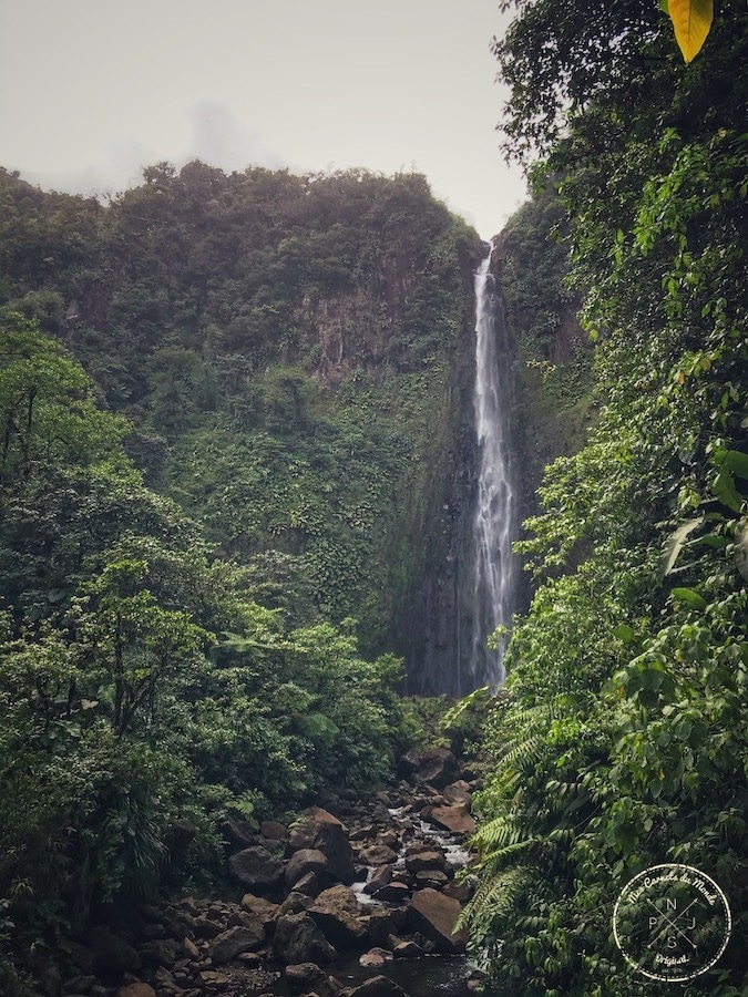 D’après le Guide du Routard : « Le Carbet prend sa source à 1300 m d’altitude, sur le flanc de la Soufrière et de l’Échelle et parcourt une 10aine de kilomètres avant de se jeter dans la mer, au sud de Capsterre-Belle-Eau. Les 3 chutes consécutives émanent de l’échec du Carbet à entamer les roches très dures, nées de diverses éruptions volcaniques. Un bel échec, donc ! Un bon plan pour s’offrir un peu de fraicheur » (enfin, jusqu’à ce qu’on entame la marche…)