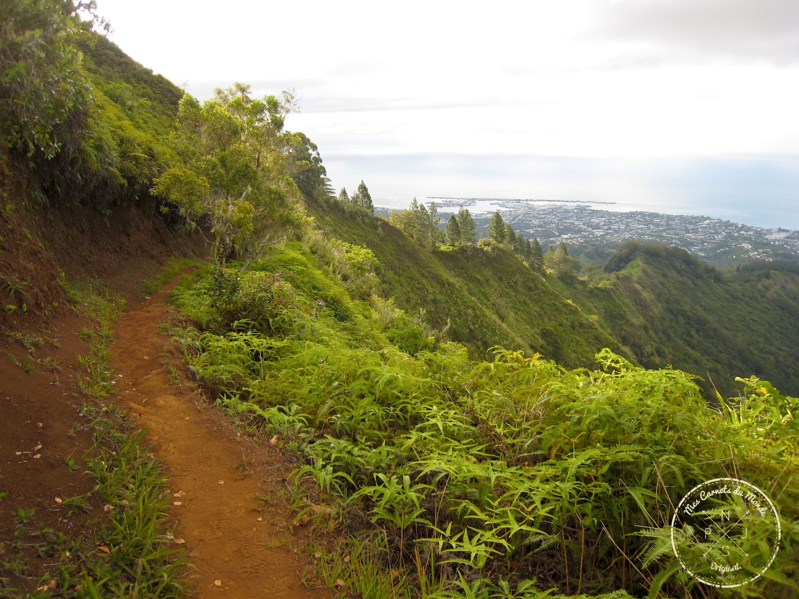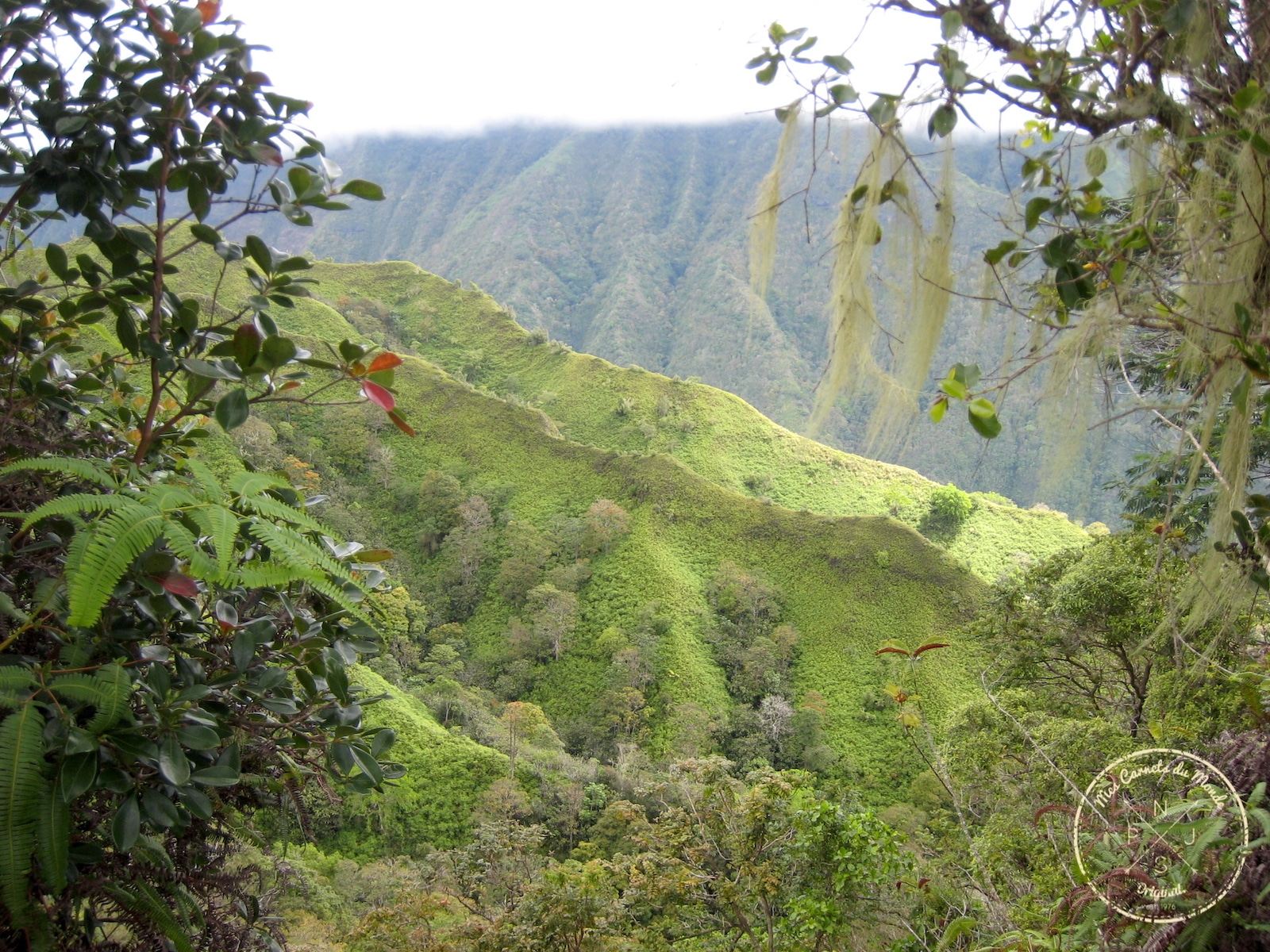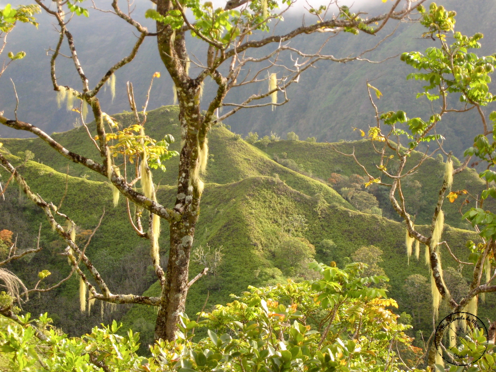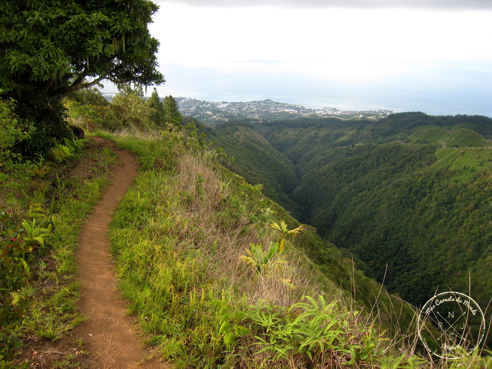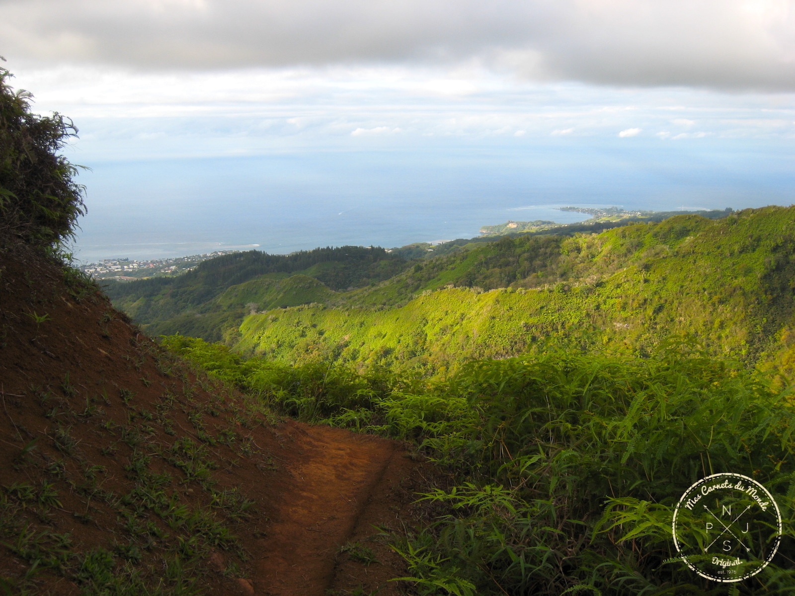 Tant pis, je n’aurais donc pas vu le rocher du diable, ni le passage à flanc de crête où il faut s’agripper aux câbles et cordes tellement c’est raide, et accéder à la crête dentelée en marche d’escaliers – paraît-il très étroite – et dont la vue « dont on jouit au sommet récompense au centuple tous les efforts, avec les autres sommets de l’ile, Moorea en toile de fond et et Papeete au nord« .