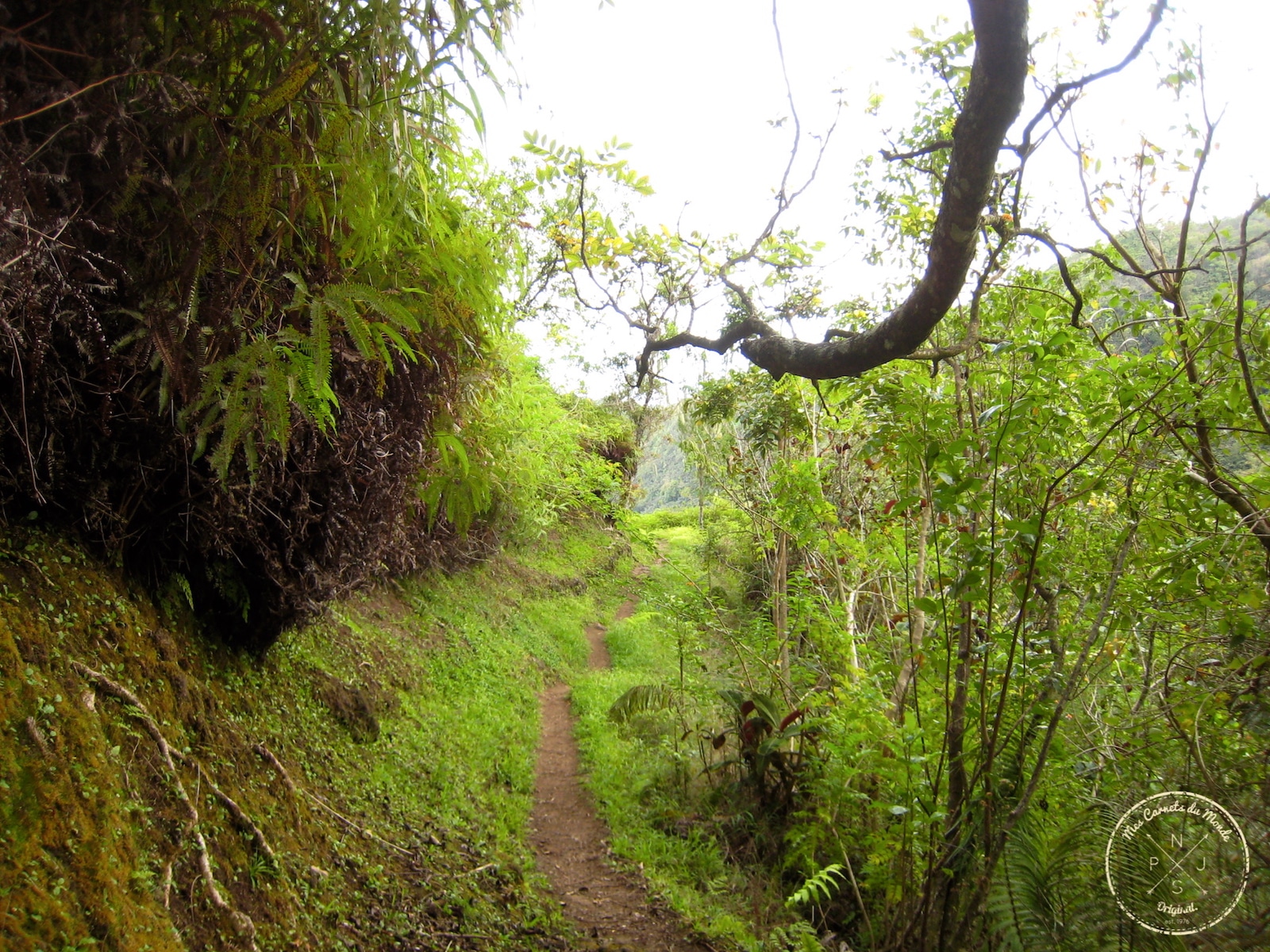 Ce qui est enthousiasmant (au début en tous cas), c’est que la randonnée alterne dès le début entre portions « agréables » (à flanc de montagne, sous l’épaisse végétation, avec une vue sur les enchaînements volcaniques) et certaines beaucoup plus raides, tellement raides d’ailleurs qu’il faut s’aider d’une corde pour grimper.