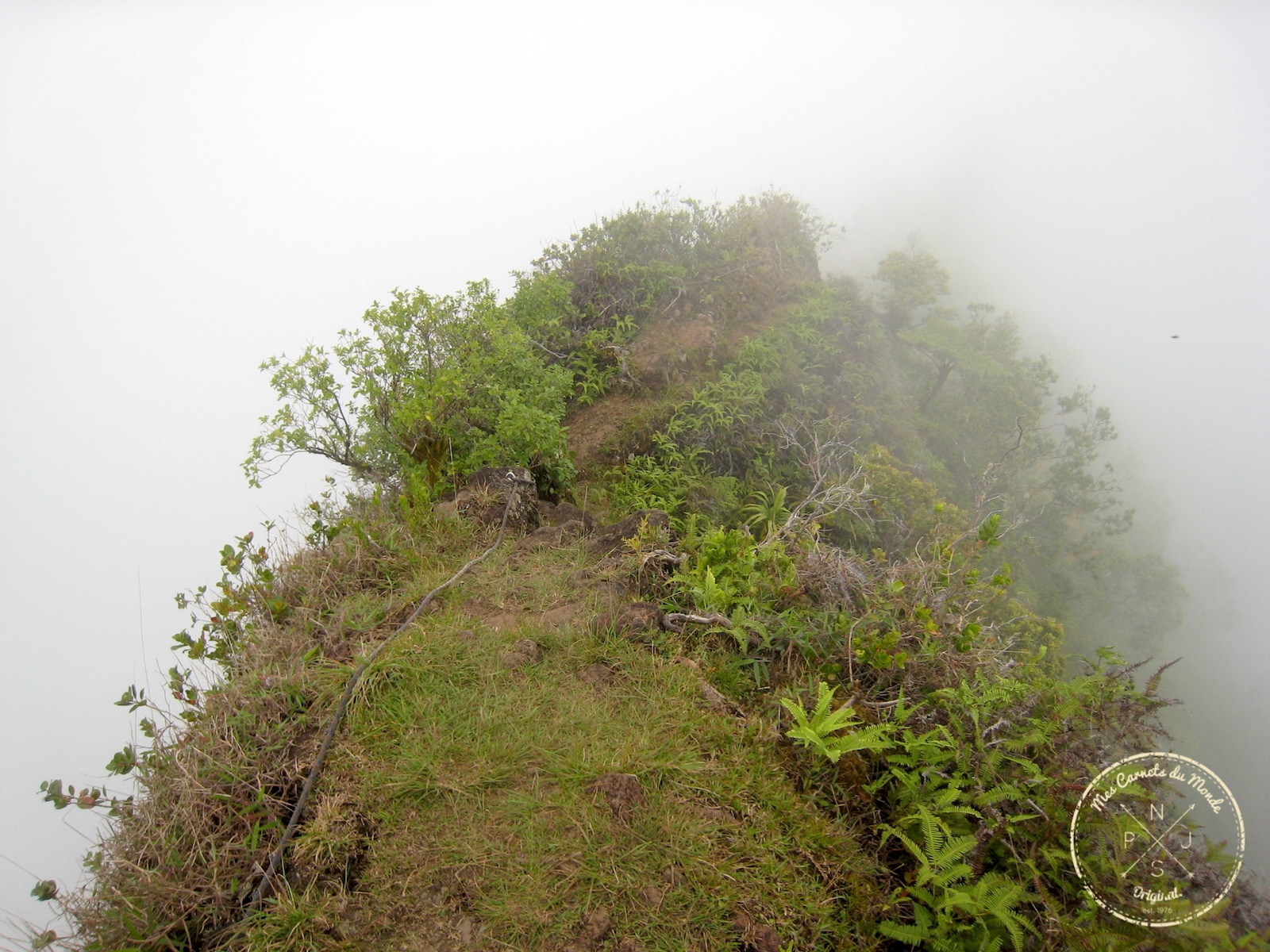 Ainsi par endroits, nous évoluons sur une crête de moins d’un mètre de large (parfois avec une vue dégagées, parfois dans la brume… c’est encore plus rigolo), avec le vide à droite et le vide à gauche…