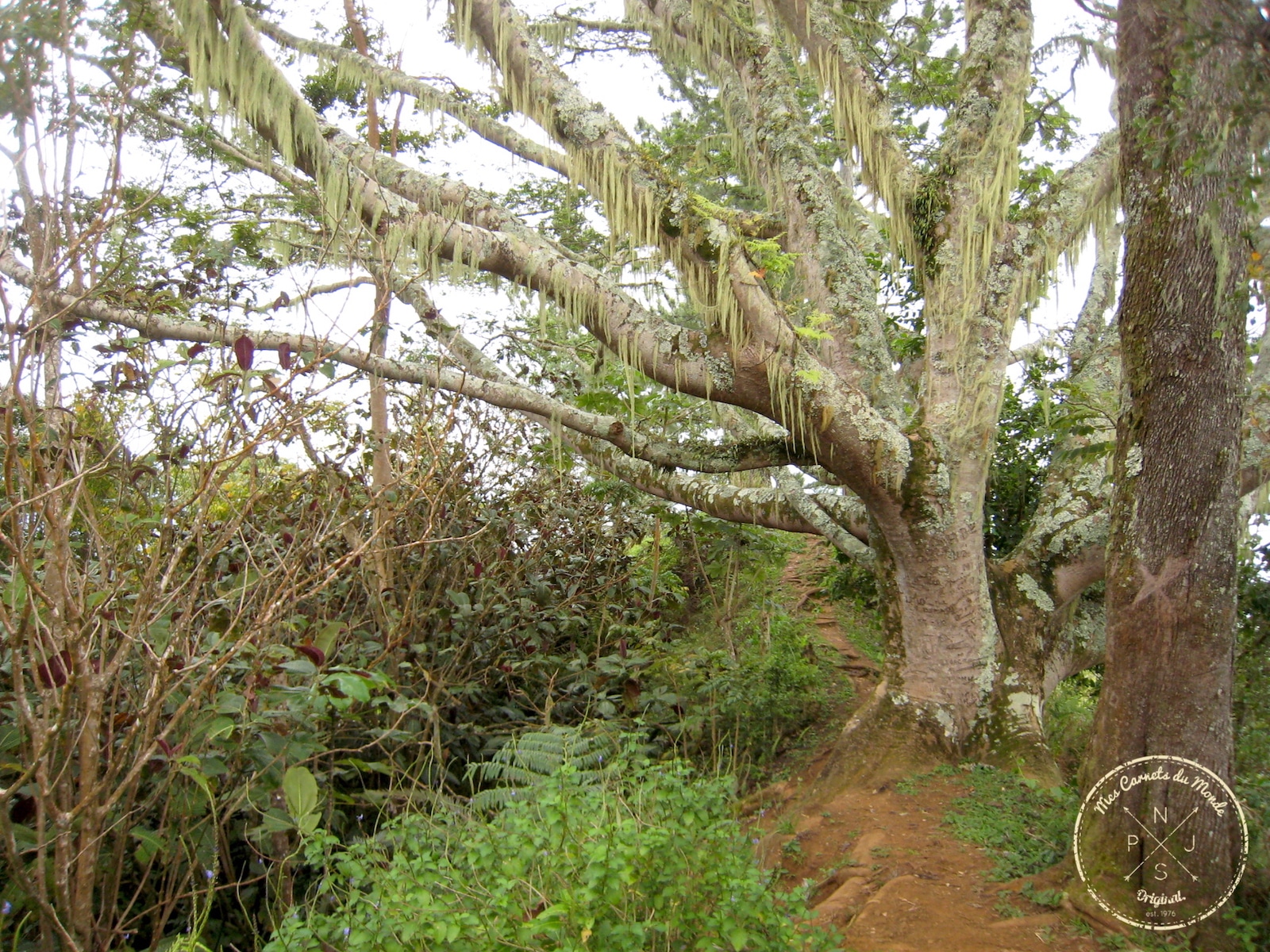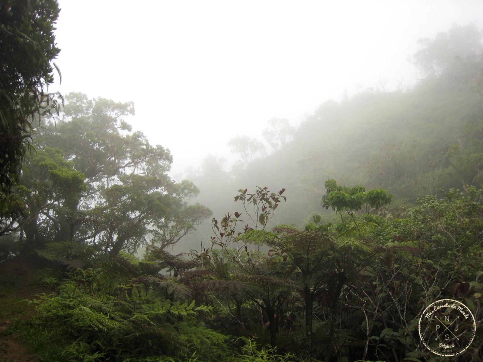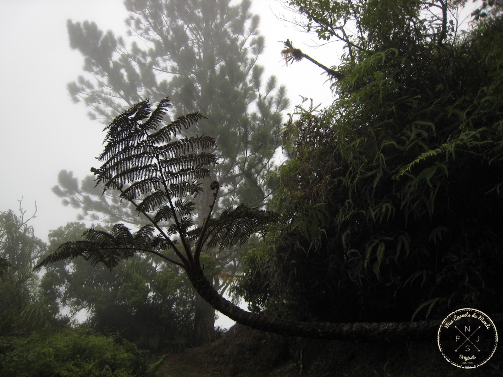 Et déjà la vue est spectaculaire, que ce soit à flanc de montagne, ou sur des petites arêtes, nous évoluons dans un décor digne du Seigneur des Anneaux : roche volcanique, chemins recouverts d’une épaisse végétation et de fougères arborescentes, avant de devenir plus rare et de laisser place aux sapins qui caressent la brume des sommets.