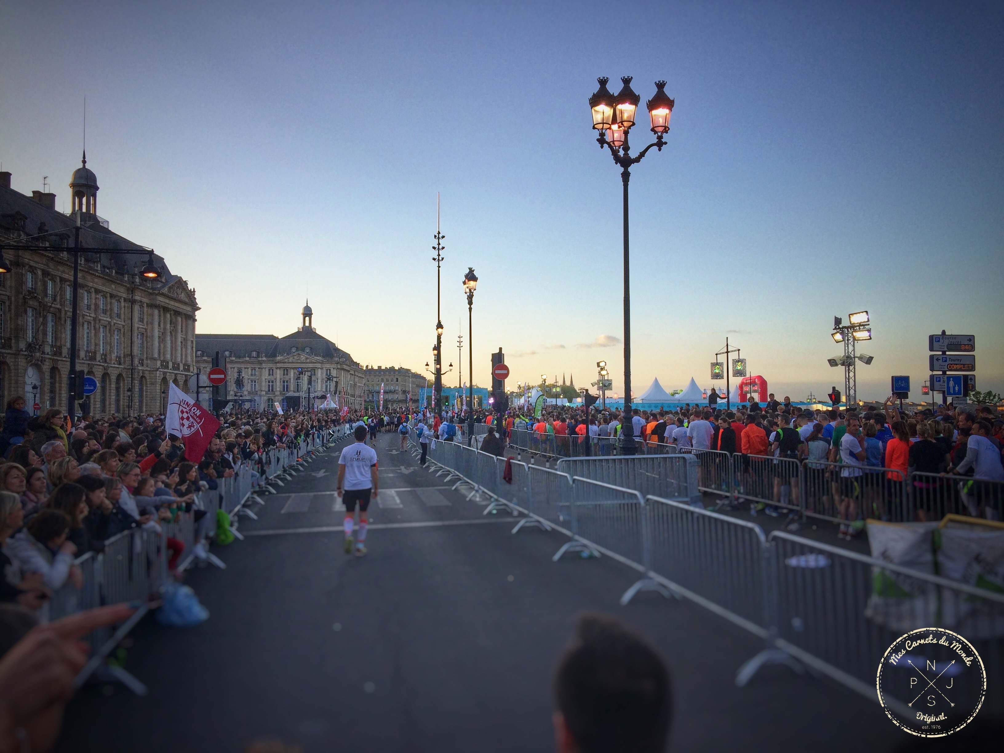 Samedi 15 avril 2017, 22h17, sur les quais de Bordeaux à hauteur de la Place de la Bourse. Au pied des bâtiments qui semblent enlacer la majestueuse Fontaine des 3 Grâces, une immense foule acclame les coureurs de la 3ème édition du Marathon et du Semi-Marathon de Bordeaux.