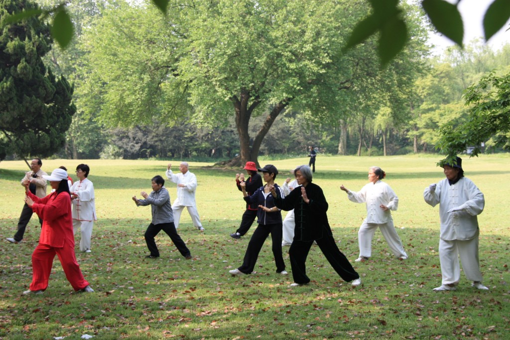on vient pratiquer le Tai-shi tôt les matins (le Tai-shi, c’est une sorte d’art martial, où les mouvements sont faits toute en douceur, et avec des postures parfois étranges… genre sur un pied, le genou plié, alors que les bras tournent lentement autour du buste… c’est étonnant à voir, mais il parait que c’est super !),